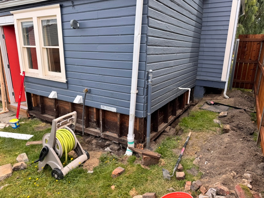 Poured concrete foundation, installed house wrap and Hardie siding, replaced window, built overhang, replaced gutters.